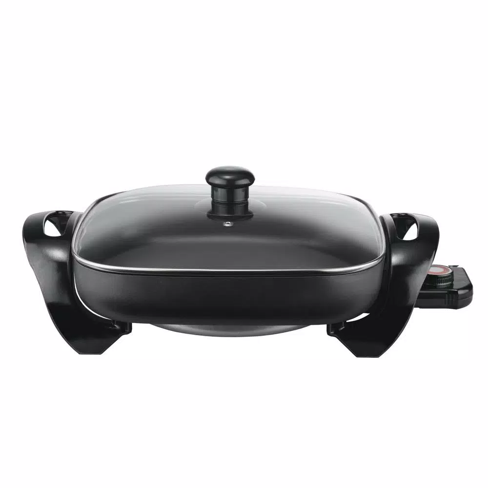 This family-sized 12 in. 1300-Watt Electric Non-Stick Skillet comes with a see-through tempered glass cover to see the cooking process. It also has a safety lock to reduce splattering and increase safety. The cool-touch handle means you don’t need to worry about burning your fingers while handling.