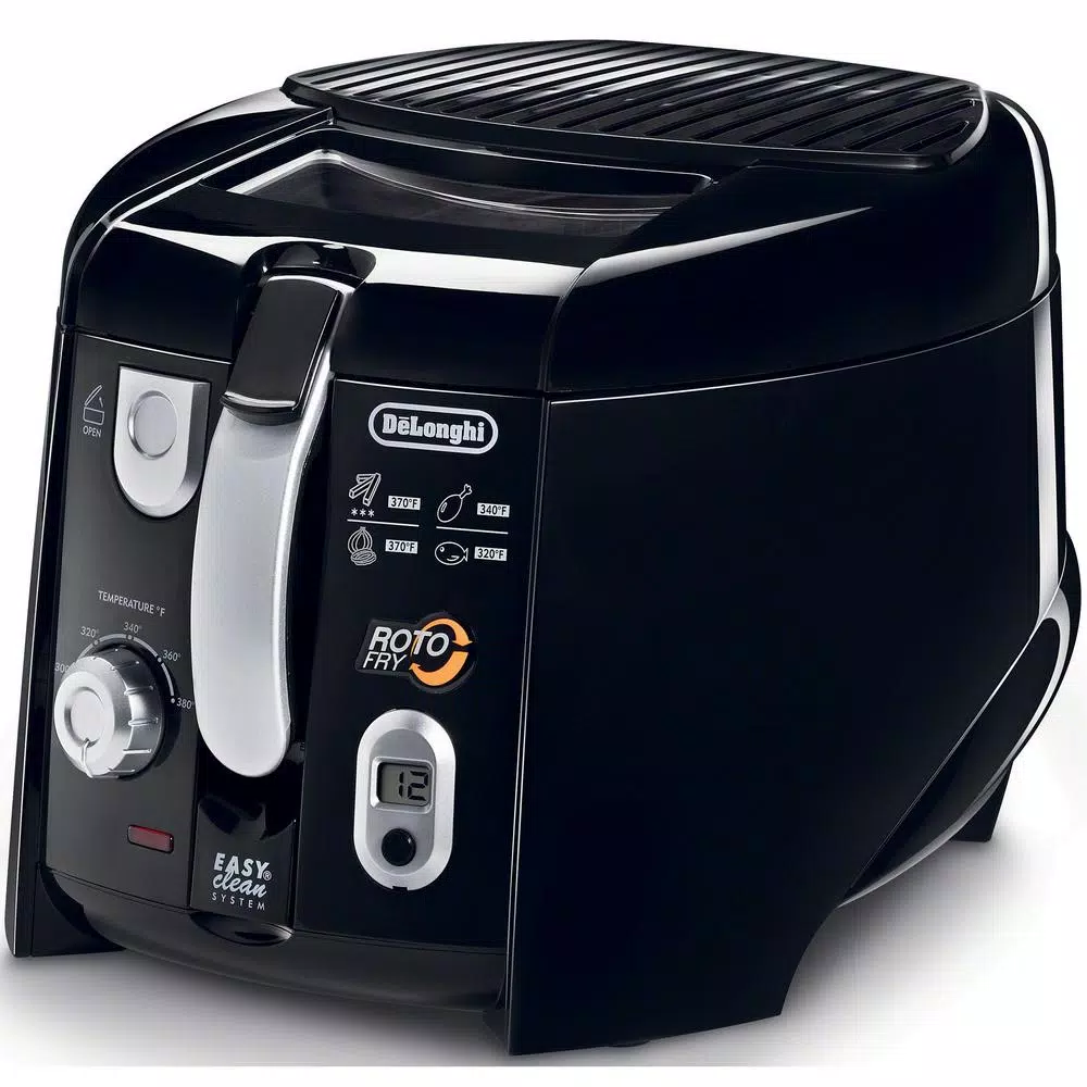Enjoy crispier and tastier food with the De’Longhi 2.2 lbs. Roto Deep Fryer. You can save on oil consumption and fry healthier by using half the oil of traditional fryers with the tilted rotating basket, which also achieves crispier results every time. If messy, hot oil cleanup scares you away from using deep fryers, the patented easy clean oil draining system will help combat your fear. Simply pull out the hose stored in the front of the fryer and drain the oil into the included collecting container. Non-stick interior and dual filtration with included replacement filters also help with the easy cleanup and lingering odor protection. If your kids like to help with the cooking you can feel safe using the fryer with them around thanks to the cool touch exterior walls and the magnetic cord that easily detaches from the fryer if accidentally pulled. For added safety, the patented condensation shield prevents oil from dripping onto the cord connection. You can check the frying progress without having to dodge splattering oil with windowed lid and outer cool touch handle. Other highlights include removable digital timer and easy-to-use adjustable thermostat.
