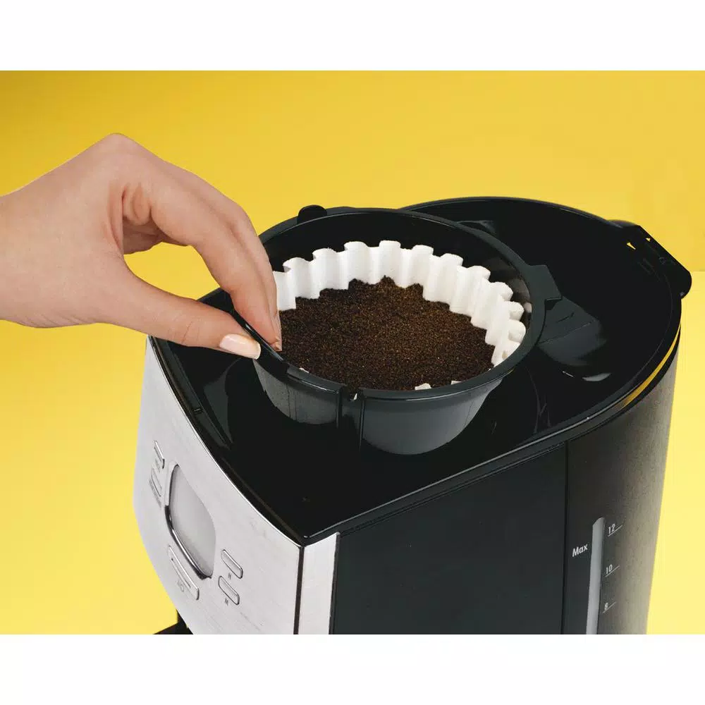 The Hamilton Beach Ensemble 12-Cup coffee maker makes consistently fresh, flavorful coffee – whether you’re brewing a few cups or serving a large group. Attractive, functional and easy to clean, the Hamilton Beach Ensemble 12-Cup coffee maker helps you serve delicious coffee and looks great on your countertop. Brew up to 12-cups of coffee Brewing options include: Regular, Bold and 1-4 Cups Glass carafe with drip-free pouring Auto pause in serve 2-hour auto shut-off Programmable timer for in. Wake up coffee Non-stick hot plate Oversized clock display Stainless steel accents Easy to use and clean 1-year limited warranty.