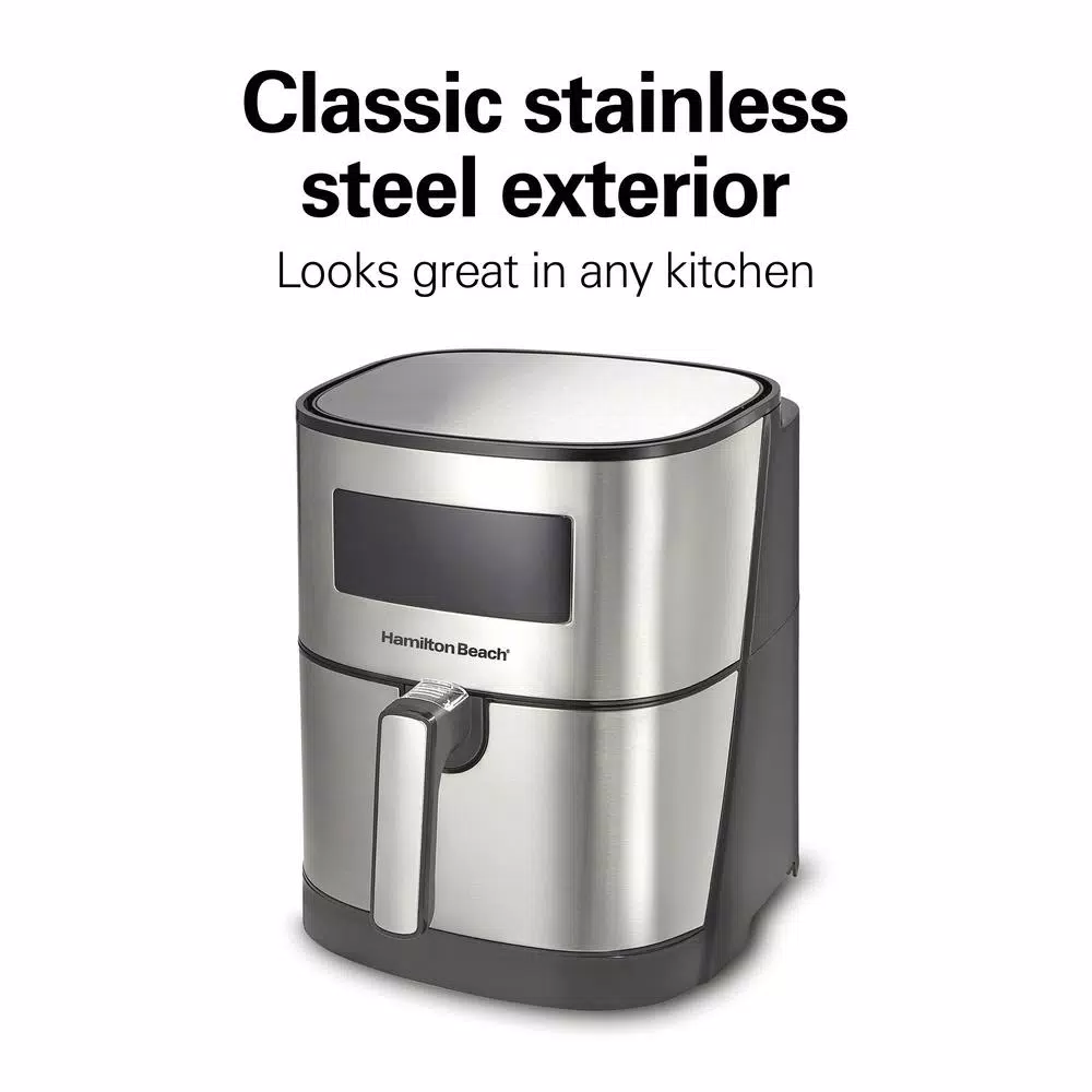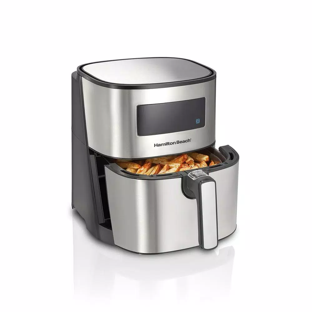 With the Hamilton Beach 5 l Digital Air Fryer, you can cook food with little to no oil, yet enjoy crispy, evenly browned food. In addition to its expert air-frying abilities, the multi-functional Hamilton Beach 5 l Digital Air Fryer also roasts, bakes and reheats a wide variety of food, from frozen fries and chicken pieces to fresh vegetables. The Hamilton Beach 5 l Air Fryer is equipped with 1700-Watt of power to evenly circulate heated air around food, so it cooks faster than a traditional or toaster oven. Youโll love how quickly it cooks and reheats everything from quick snacks to family-size meals. Its large 5 l basket fits enough food for 4-6 people or a whole chicken, and when the cooking cycle completes, an audible beep indicates that your food is ready. After the meal, the nonstick 5 l cooking basket removes for easy cleanup.