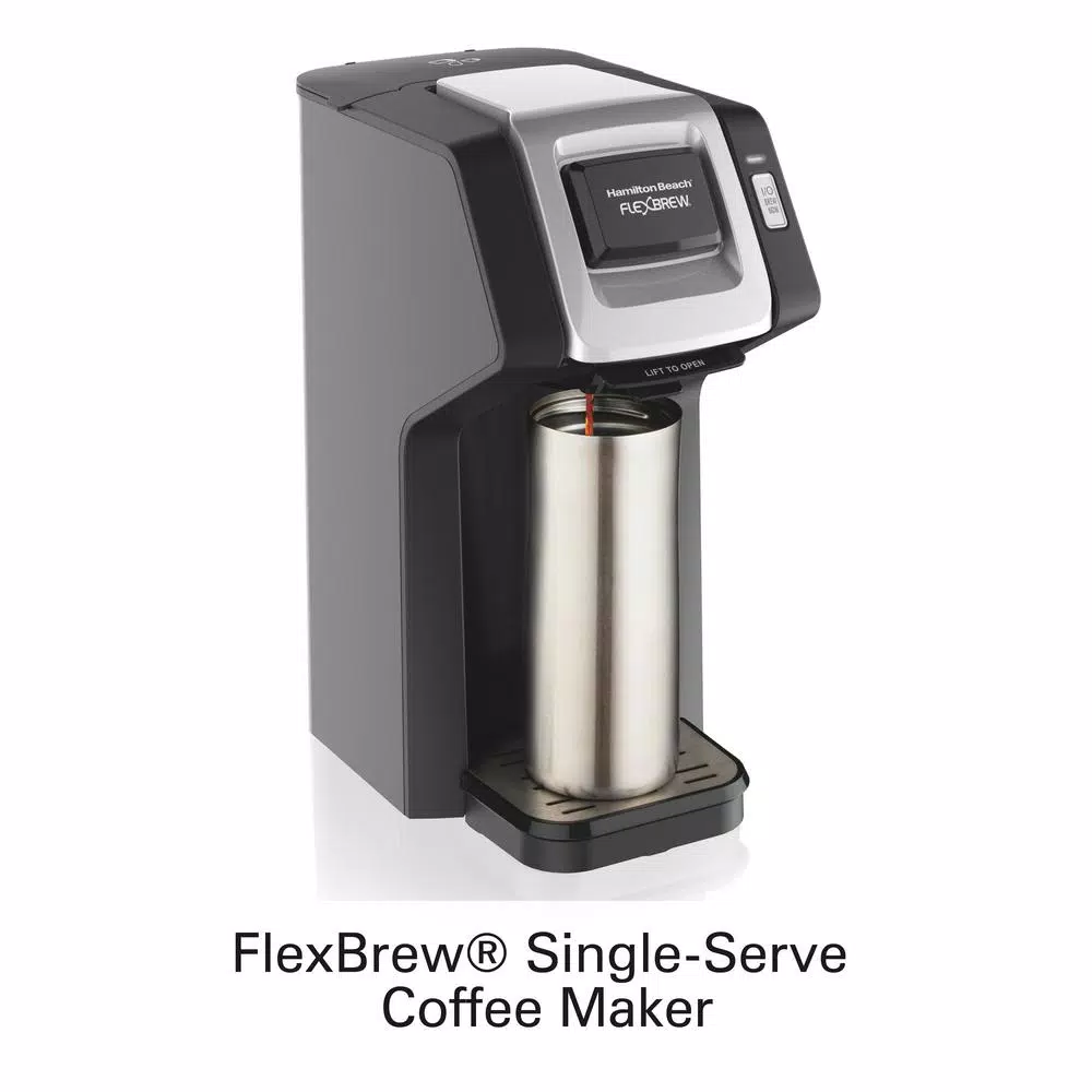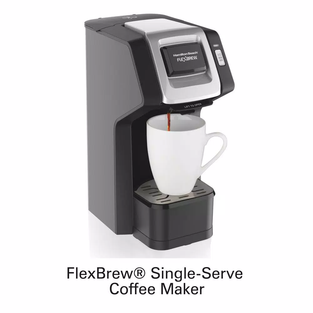 Make a personal cup of coffee with the FlexBrew Single-Serve Coffee Maker and enjoy the added flexibility of brewing freshly ground coffee and single-serve pods. With just the lowering of the lid and the press of a button, you can have a single cup of hot coffee, brewed from a K-Cup*pod or your own grounds.This single-serve coffee maker lets you brew up to 10 oz. with a single pod, or up to a 14 oz. travel mug with grounds. With an easy-fill water reservoir and water-window, theres never any confusion or over-filling. A removable cup rest doubles as a storage container to hold the brew basket or single-serve pod holder when not in use. The included grounds basket is reusable, and the single-serve pod-piercing assembly removes for easy cleaning.