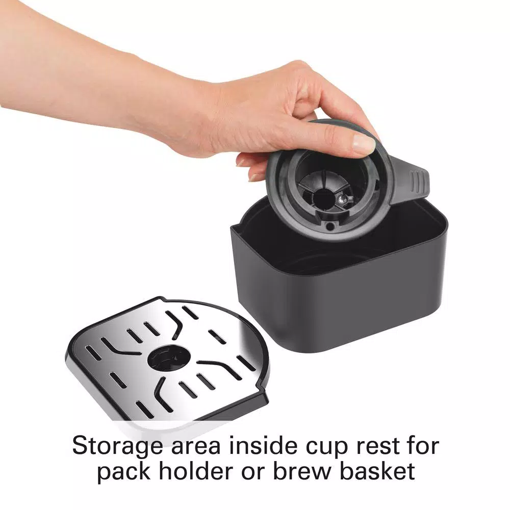 - Storage area inside cup rest for single-serve pack holder or brew basket