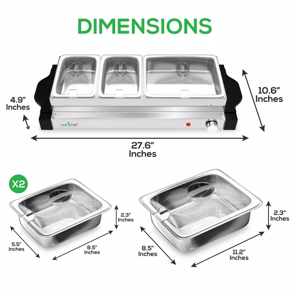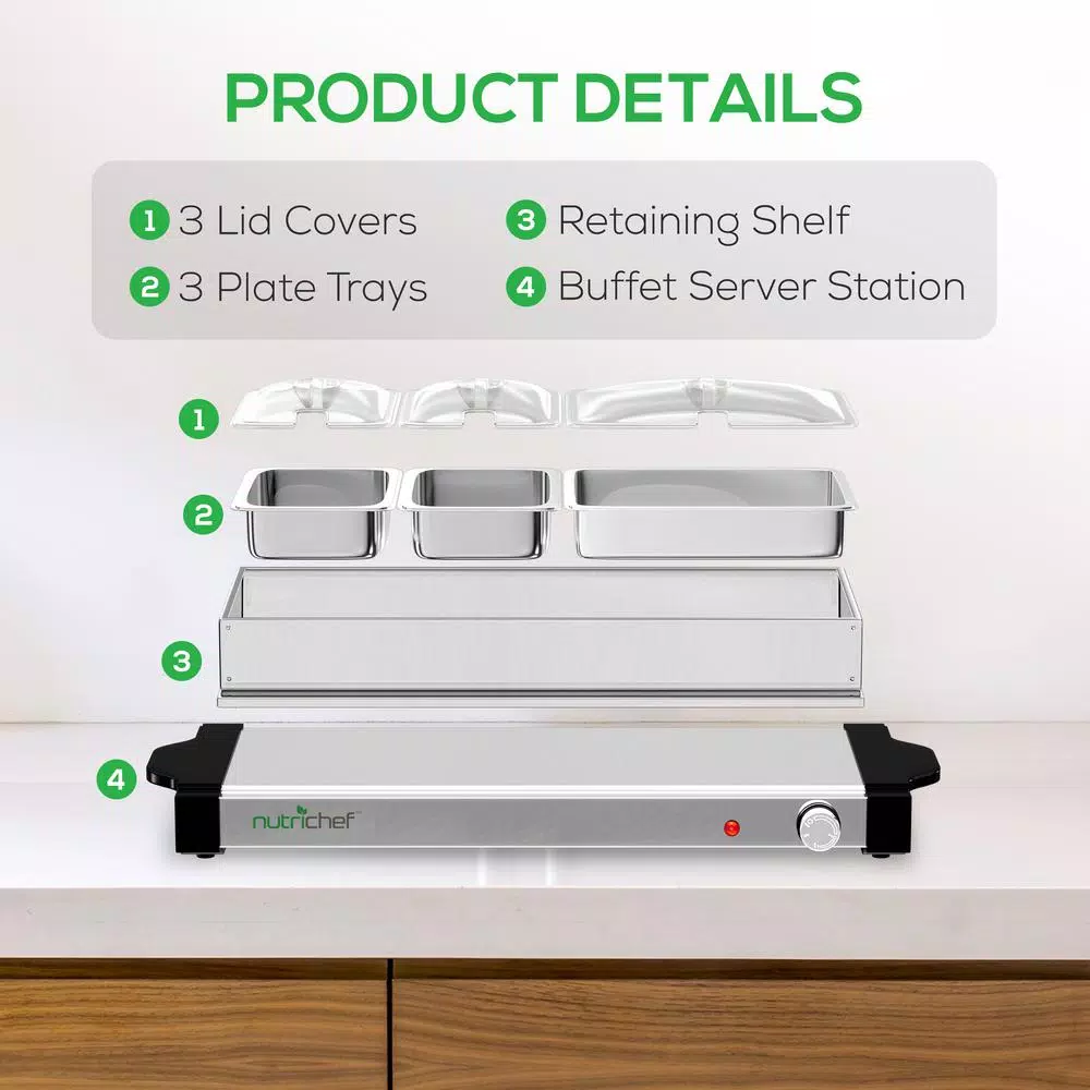 NutriChef was created on the principle that healthy home cooking should be attainable to all, regardless of skill level and economic status. Starting in 2014, we noticed the disconnect in our lives and in the lives of those around us. We were so busy, always rushing forward, and our health and personal lives suffered. We needed to find some way to slow down and put our health first, all without sacrificing convenience or taste. Could we somehow create healthier versions of our favorite foods, easily in our own kitchens. The answer was a resounding yes, and NutriChef was born. What’s in the Box: – Buffet Server Station – Large Warming Plate Tray – 2-Medium Warming Plate Trays – 3-Lid Covers Technical Specs: – High-Powered Heating Element:180 Watt – Temperature Range: 32-257° Fahrenheit (0-125° Celsius) – Medium Buffet Tray Capacity: 1.6 qt. (1.5+ Liter) -Each – Large Buffet Tray Capacity:3.2 qt. (3+ Liter) – Construction Material: Stainless Steel, Engineered ABS – Power Cable Length: 3.6 in. ft. – Power Supply: 110V – 1.5 in. L Medium Warming Plate Size : 8.5 in. L x 5.5 in. W x 2.3 in. H (Each) – 3.0 L Large Warming Plate Size : 11.2 in. L x 8.5 in. W x 2.3 in. H – Total Assembled Size (L x W x H): 27.6 in. L x 10.6 in. W x 4.9 in. H