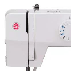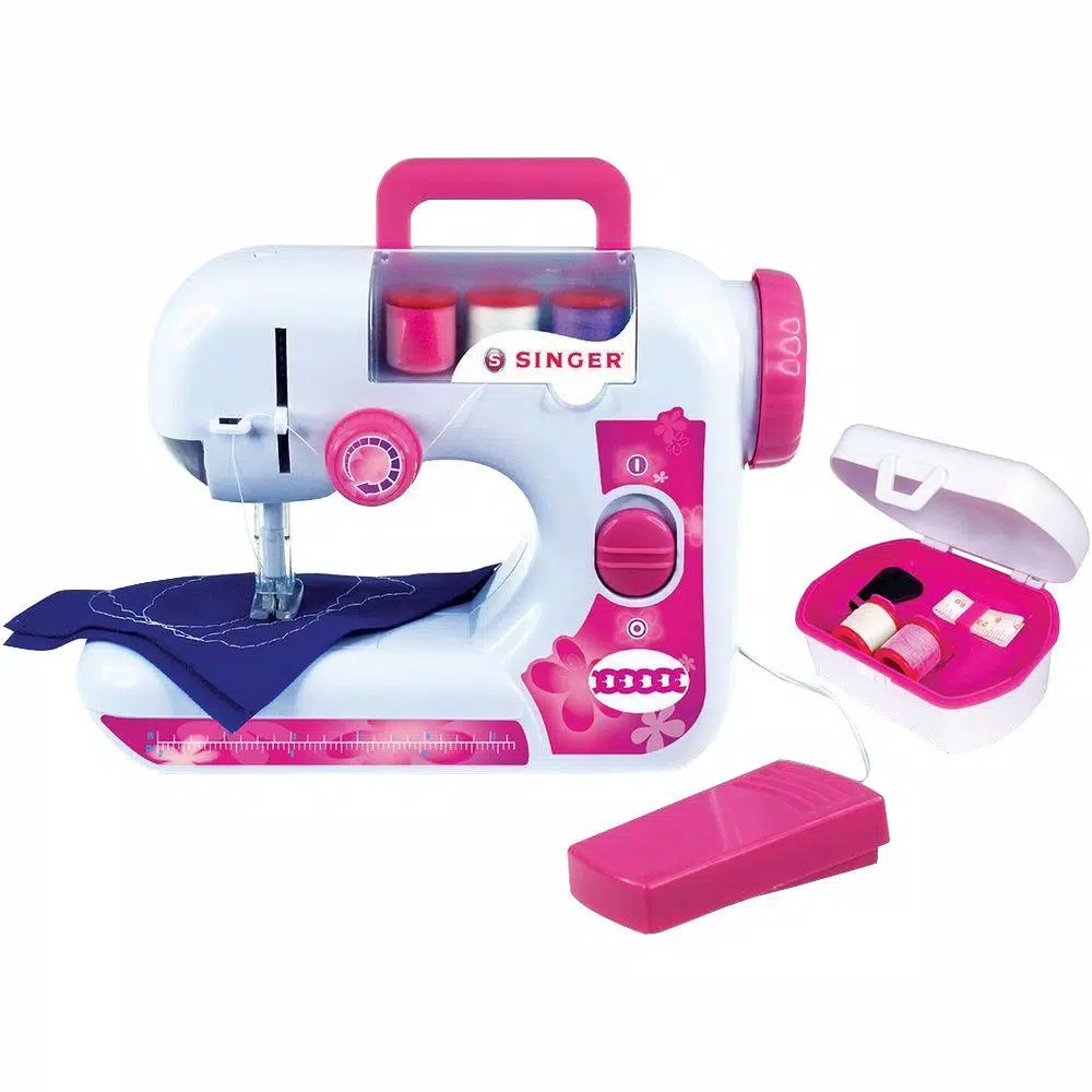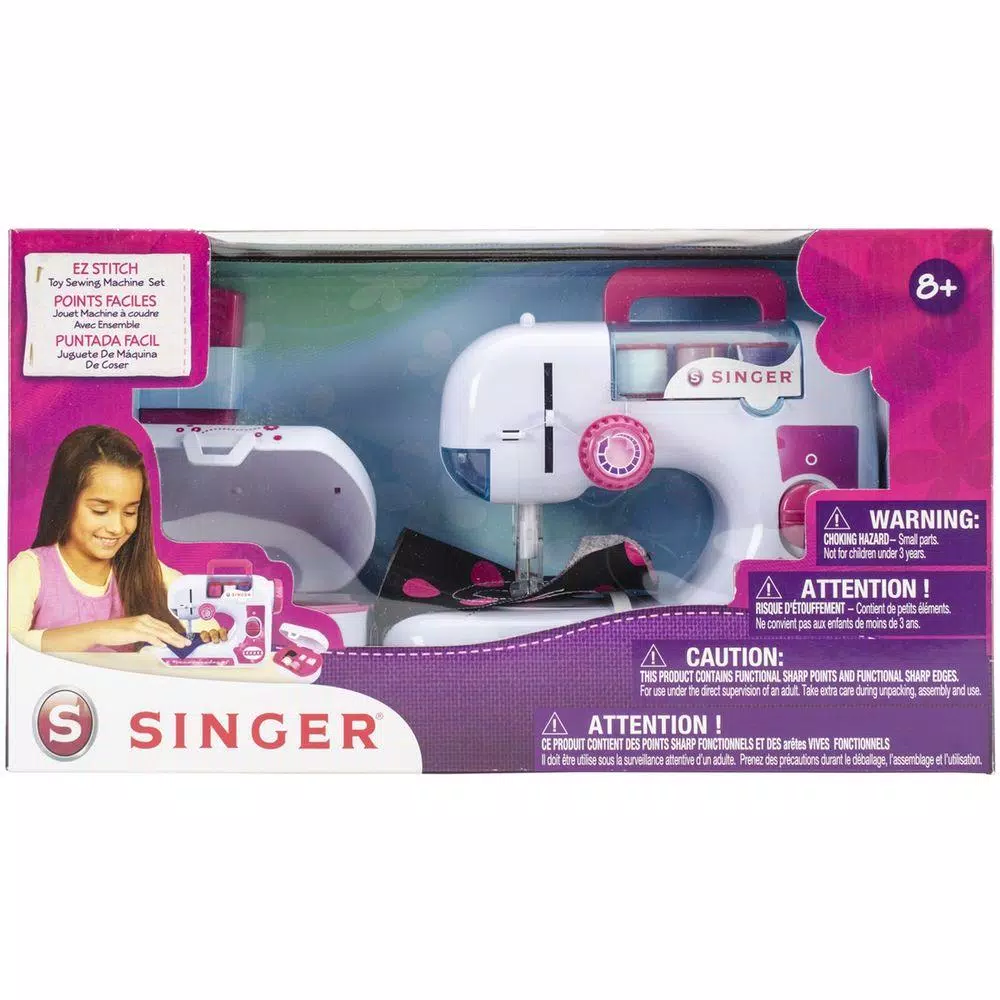 NKOK-Singer EZStitch Sewing Machine with Sewing Kit. Perfect for beginner sewers. This machine features a tension dial, foot pedal, on/off switch, hand wheel, measuring ruler, protective cover, spool compartment and easy carrying handle. Make your own fashion accessories. This package contains one sewing machine, five spools of thread, measuring tape, one needle threaded and instructions. Requires four 1.5 V LR6 AA batteries (not included). Recommended for ages 8 and up. Warning: choking hazard-small parts. Not for children under 3 years.