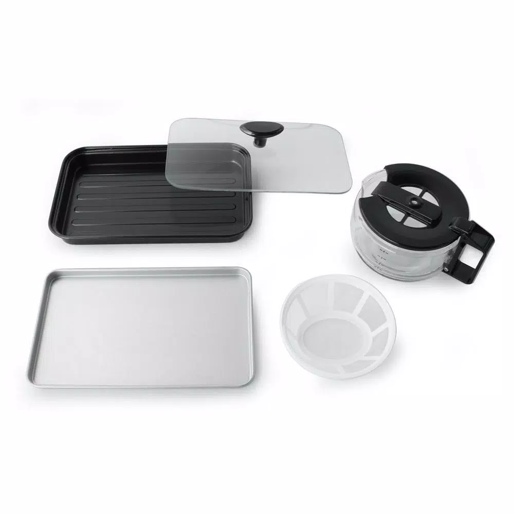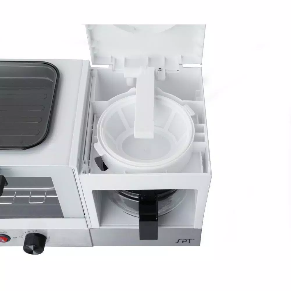 SPT 3-in-1 Breakfast Maker combines all the breakfast necessities into one: Toaster Oven, Coffee Maker and Oven-Top Griddle. The new white cabinet with stainless steel control panel gives it a modern and sleek look. This is the perfect compact appliance for dorms, offices, RV’s, studios or wherever space is limited. You can brew a fresh cup of coffee, toast couple slices of bread and fry up an egg all at once.