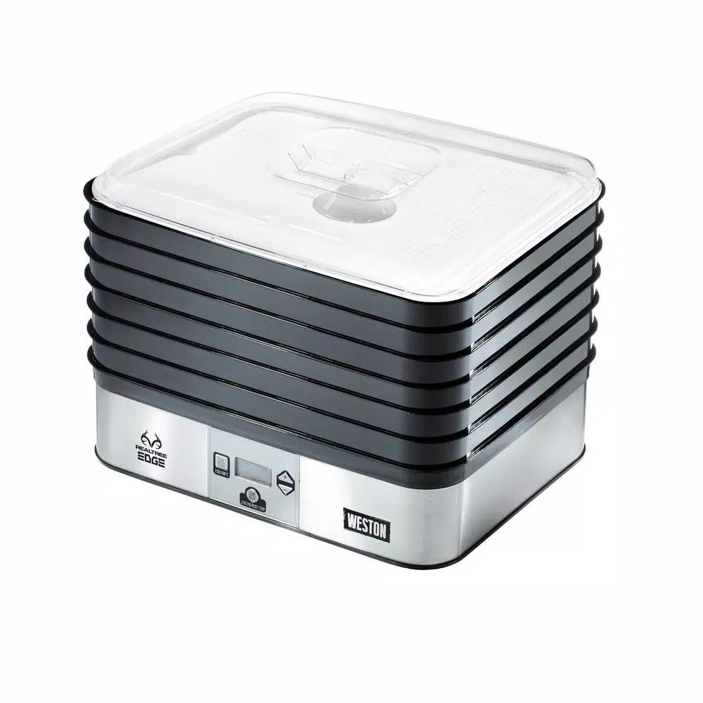The Realtree Edge by Weston 6 Tray Digital Food Dehydrator Plus is the perfect tool to preserve foods for later use. Use to dry the seasonโs harvest for meats, making jerky and a variety of snacks. Ideal for making banana chips, fruit rollups, dried herbs, fruits and vegetables. The adjustable digital thermostat lets you adjust the drying temperature from 100ยฐ F โ 160ยฐ F and has a 48 hour timer with automatic shut off. The continuous air flow provides even drying for better taste. Includes one fine-mesh sheet for drying small foods like herbs and one solid sheet for making fruit roll ups. Includes a Realtree Edge storage cover.
